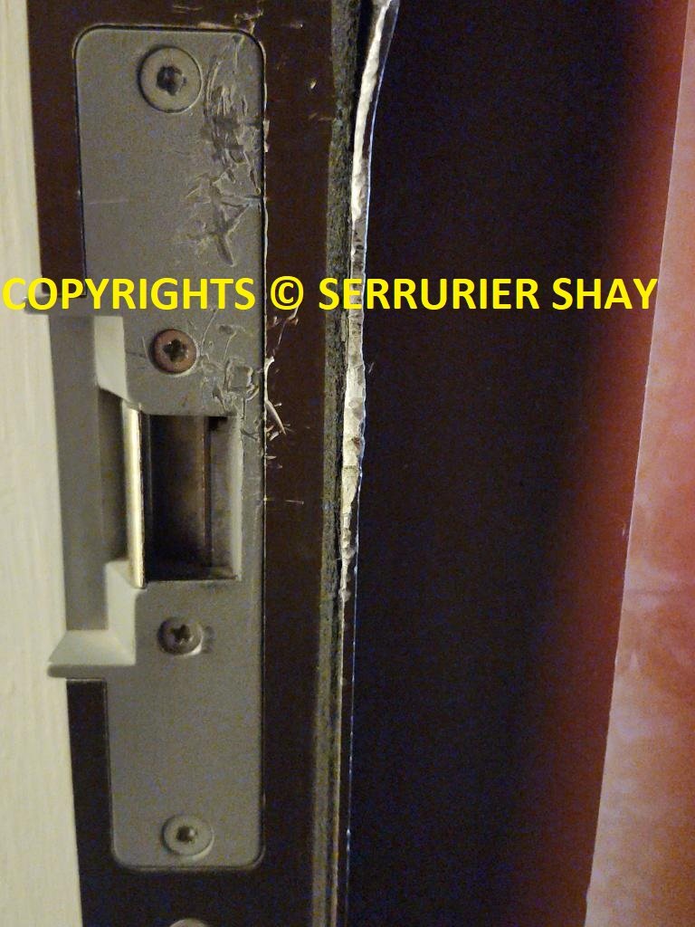 The strike latch (lip) breaks off — exactly what we see after forced entry.