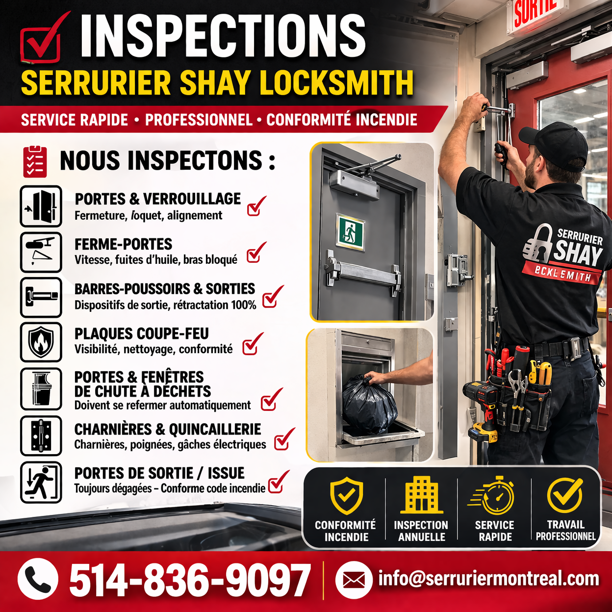 Propriétaires d’immeubles et gestionnaires immobiliers, attention ! 🏢🔥 Le service incendie effectue des inspections annuelles pour s’assurer que votre bâtiment est sûr et conforme. Chez Serrurier Shay, nous sommes spécialisés dans l’inspection, la réparation et l’entretien des portes, afin que vous puissiez passer vos inspections sans stress.
